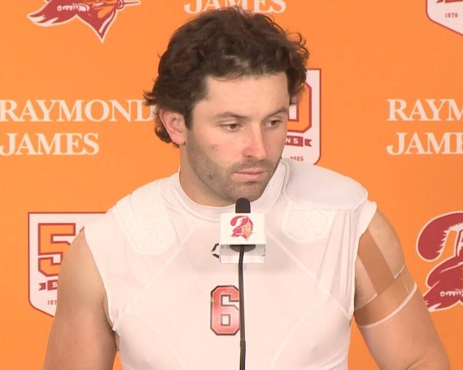 Baker Mayfiled meets the press after the Bucs lose to the Falcons 29-28 in a Thursday night game.