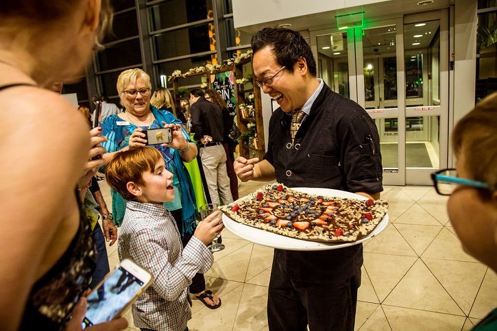 Chocolate bark topped with grasshoppers, black ants, bambood worms, berries and rice crips were all on the menu last Friday evening at the Museum of Fine Arts St. Petersburg. Chef Joseph Yoon, right, displays a dessert at the museum’s BugsGiving event. The chef, executive director of Brooklyn Bugs, created a tasting menu of 10 dishes inspired by the MFA’s current special exhibition, ‘The Grasshopper and the Ant’ and Other Stories, as told by Jennifer Angus, The exhibition is on display through Jan. 5./Photo by Allison Lynn Photography/ via the MFA.