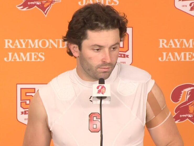 Baker Mayfiled meets the press after the Bucs lose to the Falcons 29-28 in a Thursday night game.