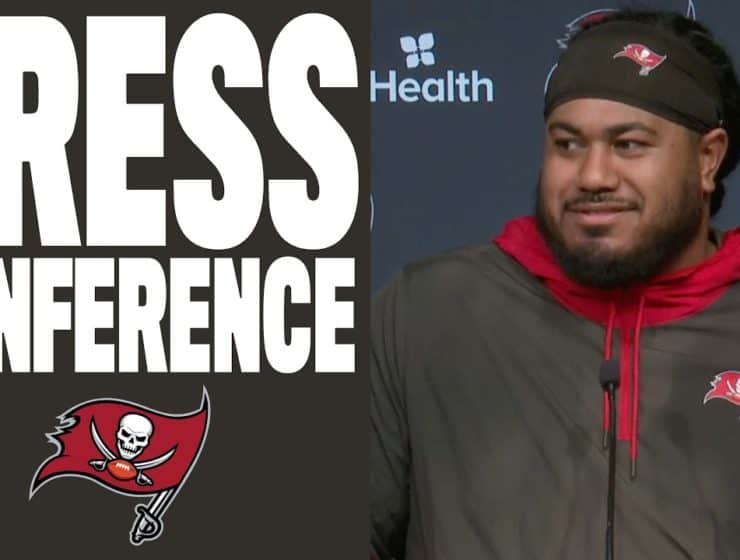 Presser by Tampa Bay Buccaneers DL Logan Hall, LB SirVocea Dennis & TE Devin Culp.